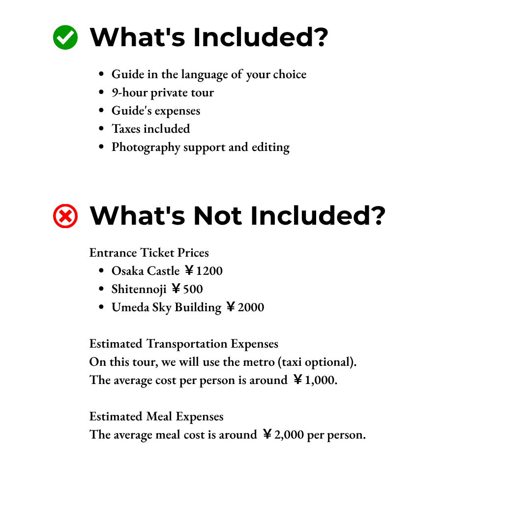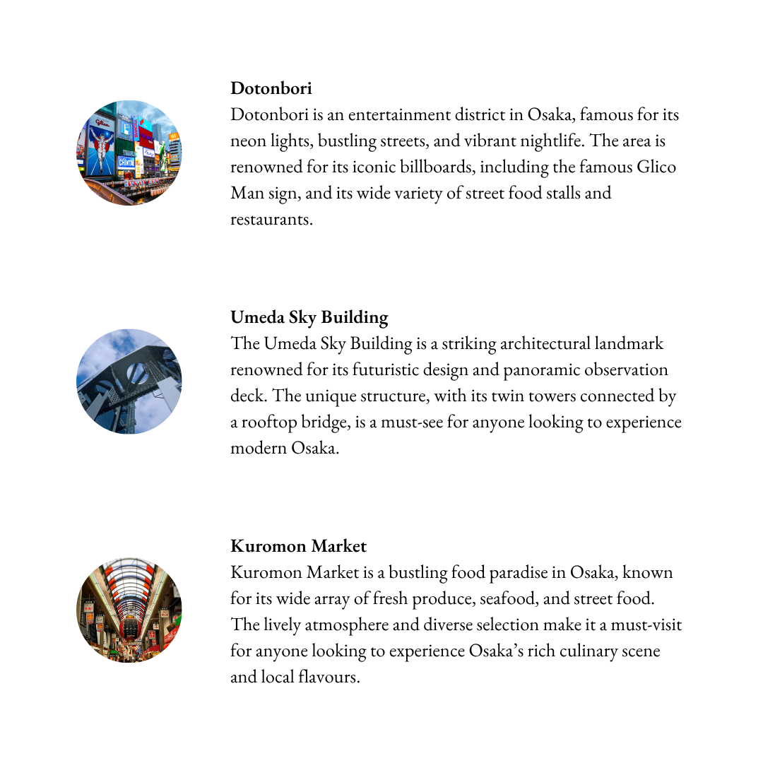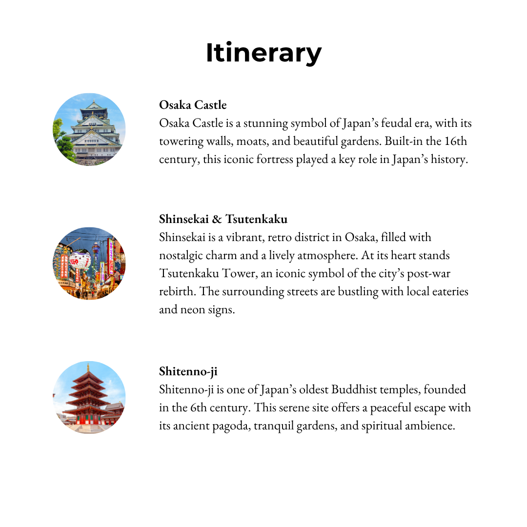 Discover Osaka’s ancient castles, wander through centuries-old temples, explore iconic landmarks, and dive into the vibrant streets filled with flavours and lights. This is your chance to experience the best of Osaka, where the past and present meet in one unforgettable day.